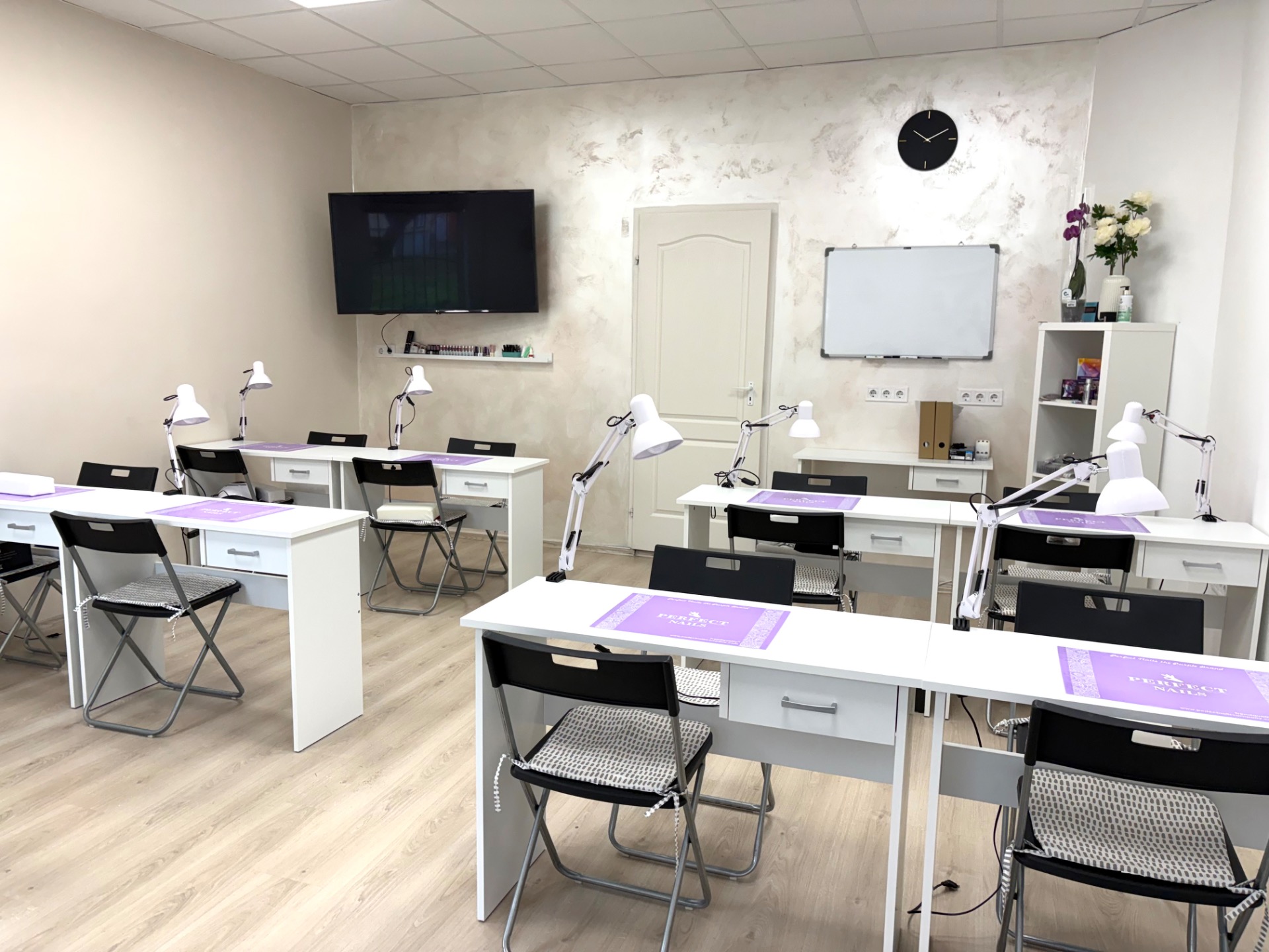 A tanterem teljes körűen felszerelt a professzionális műköröm oktatás igényeihez: asztali és UV lámpák, széles színválasztékú gél lakkok, minőségi építőanyagok és változatos díszítőelemek állnak rendelkezésre a gyakorlati oktatás során.